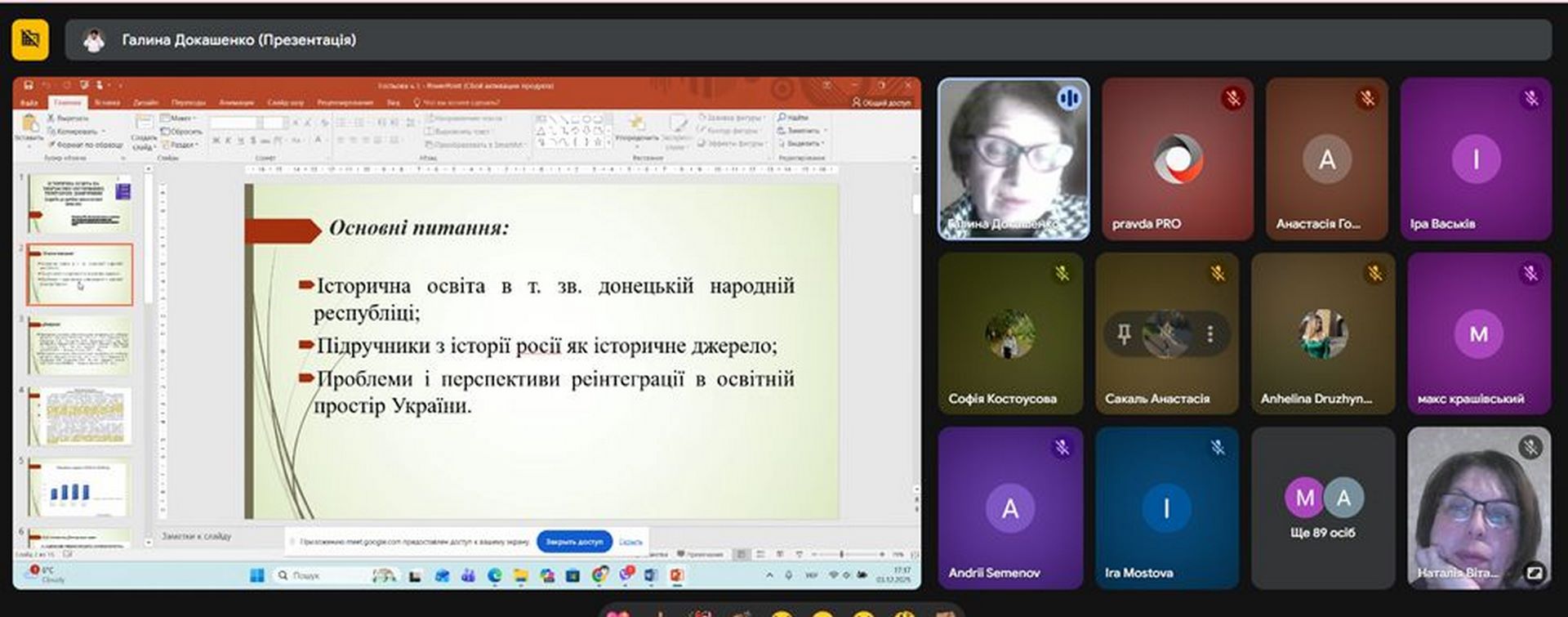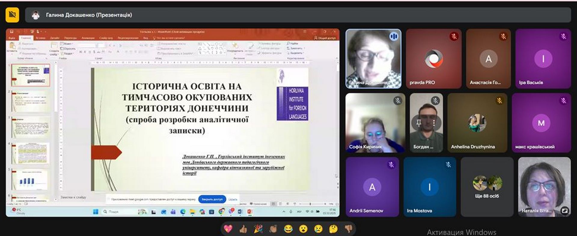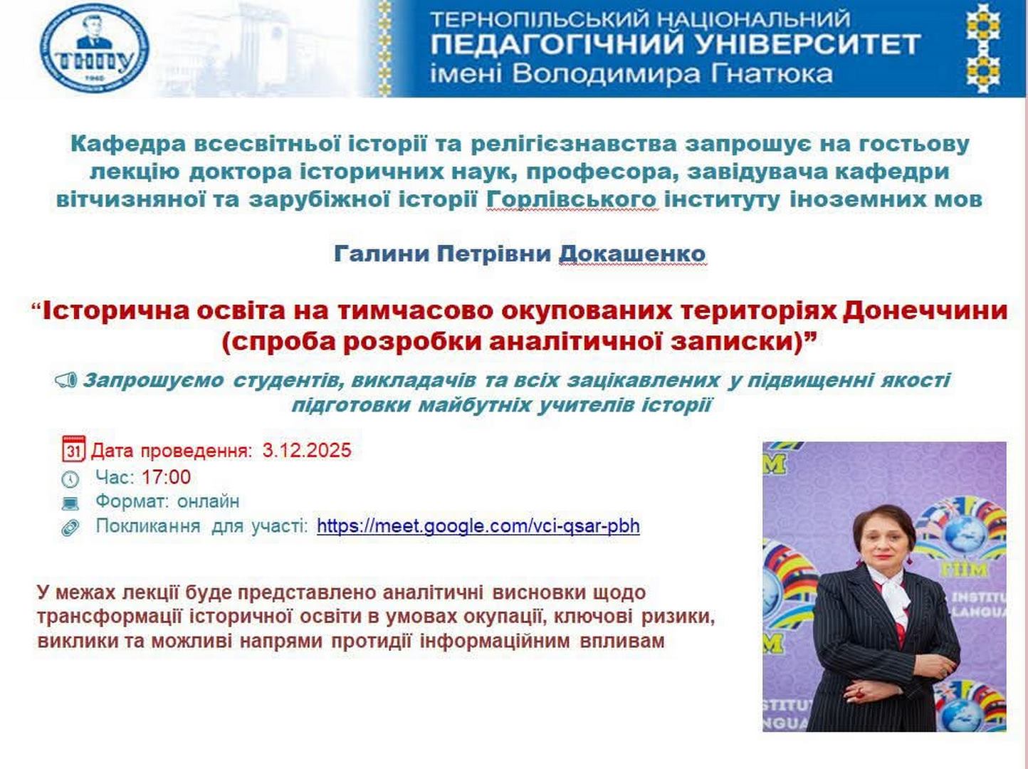 3 грудня 2025 року відбулася гостьова лекція на тему «Історична освіта на тимчасово окупованих територіях Донеччини (спроба розробки аналітичної записки)», яку провела докторка історичних наук, професорка кафедри всесвітньої історії та релігієзнавства, завідувачка кафедри вітчизняної та зарубіжної історії Горлівського інституту іноземних мов Галина ДОКАШЕНКО.