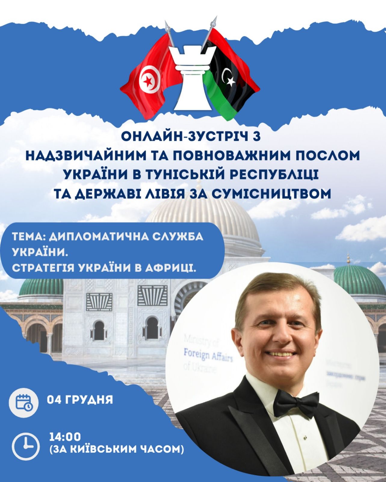 04 грудня 2025 року відбулася онлайн-зустріч з Надзвичайним і Повноважним Послом України в Туніській Республіці та Державі Лівія за сумісництвом Й.В. Паном Володимиром ХОМАНЦЕМ.