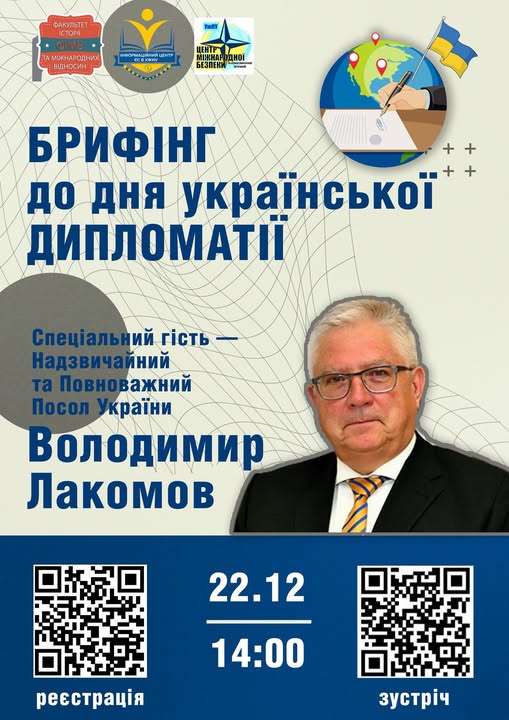 22 грудня 2025 року, з нагоди свята – Дня працівників дипломатичної служби, відбулася онлайн-зустріч з Надзвичайним і Повноважним Послом Й.В. Паном Володимиром ЛАКОМОВИМ.
