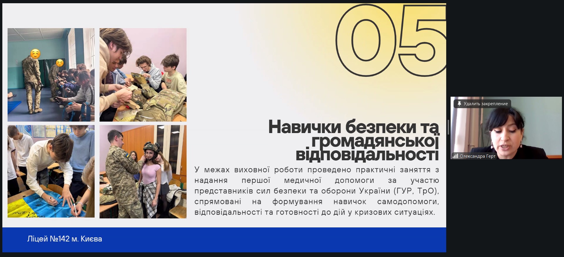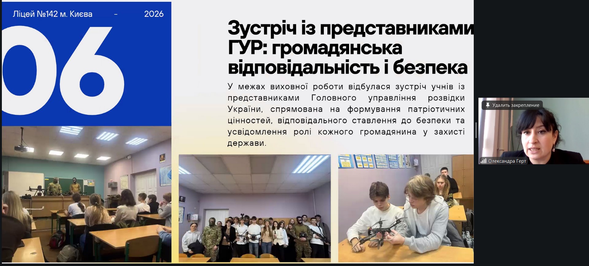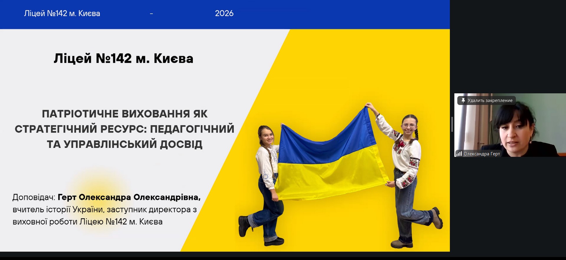 Досвід презентувала Олександра Герт, учителька історії України, заступник директора з виховної роботи Ліцею №142 м. Києва (Солом’янський район). У своєму виступі вона акцентувала увагу на практичних підходах до інтеграції патріотичного виховання в освітній процес, показала, як історія може ставати живим простором формування критичного мислення, ціннісних орієнтацій і громадянської відповідальності учнів.