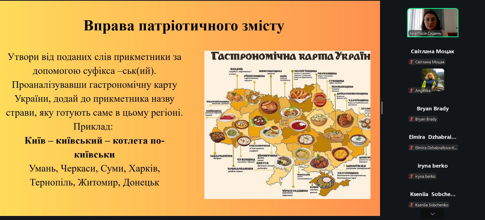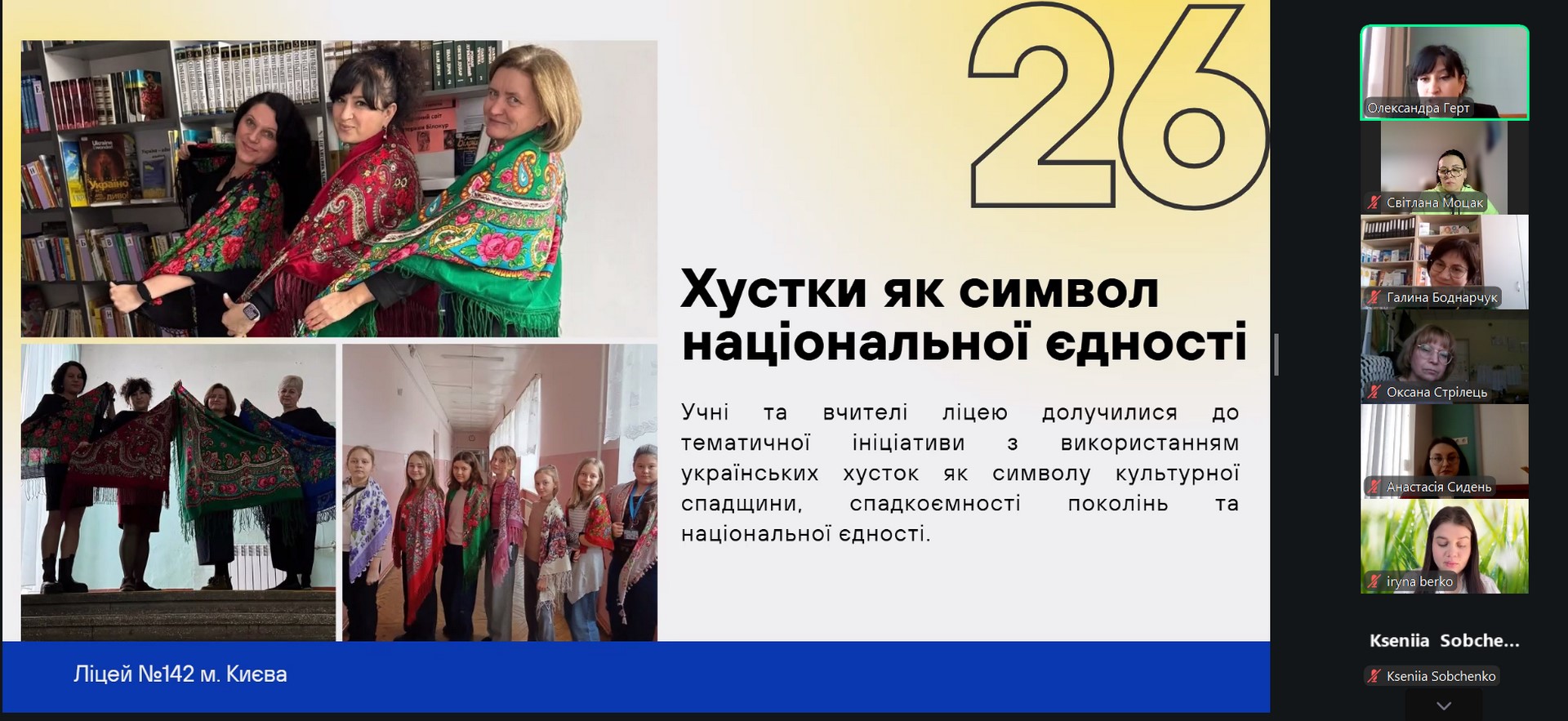 Також із доповіддю виступила Анастасія Сидень, яка представила тему «Національно-патріотичне виховання на уроках української мови». У своїй презентації вона продемонструвала можливості мовно-літературної освітньої галузі у формуванні національної свідомості учнів, розвитку їхньої мовної культури та громадянської ідентичності через зміст навчального матеріалу й методичні підходи.