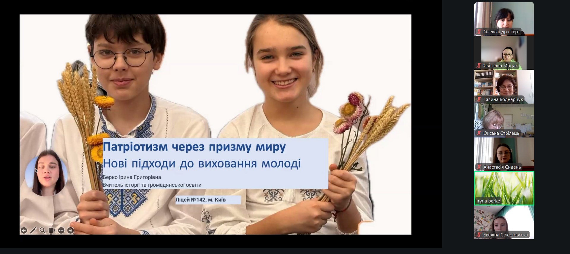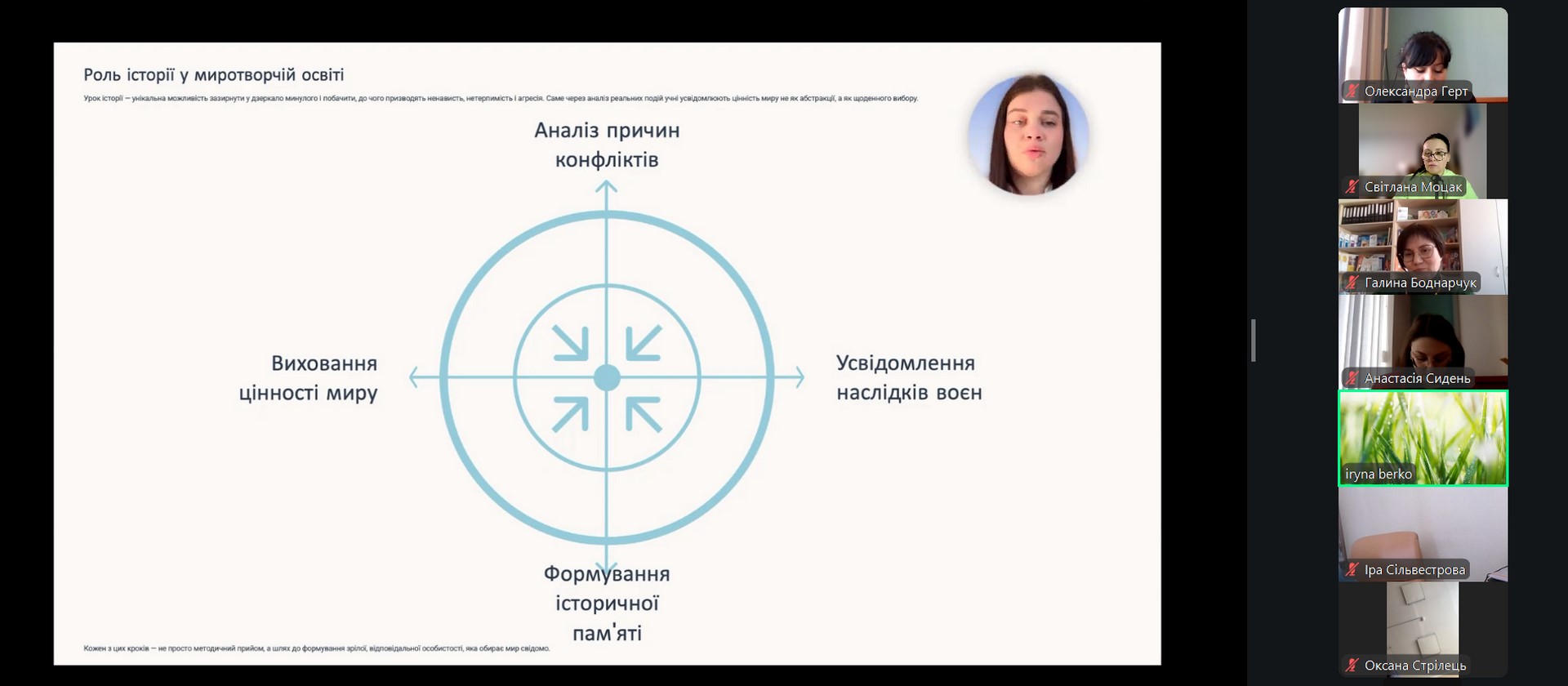 Окрему увагу учасників привернула презентація соціального педагога, вчителя історії та громадянської освіти Ірини Берко на тему: «Патріотизм через призму миру: нові підходи до виховання молоді». У виступі було висвітлено сучасні підходи до формування патріотичних цінностей на засадах культури миру, толерантності, діалогу та відповідальності.