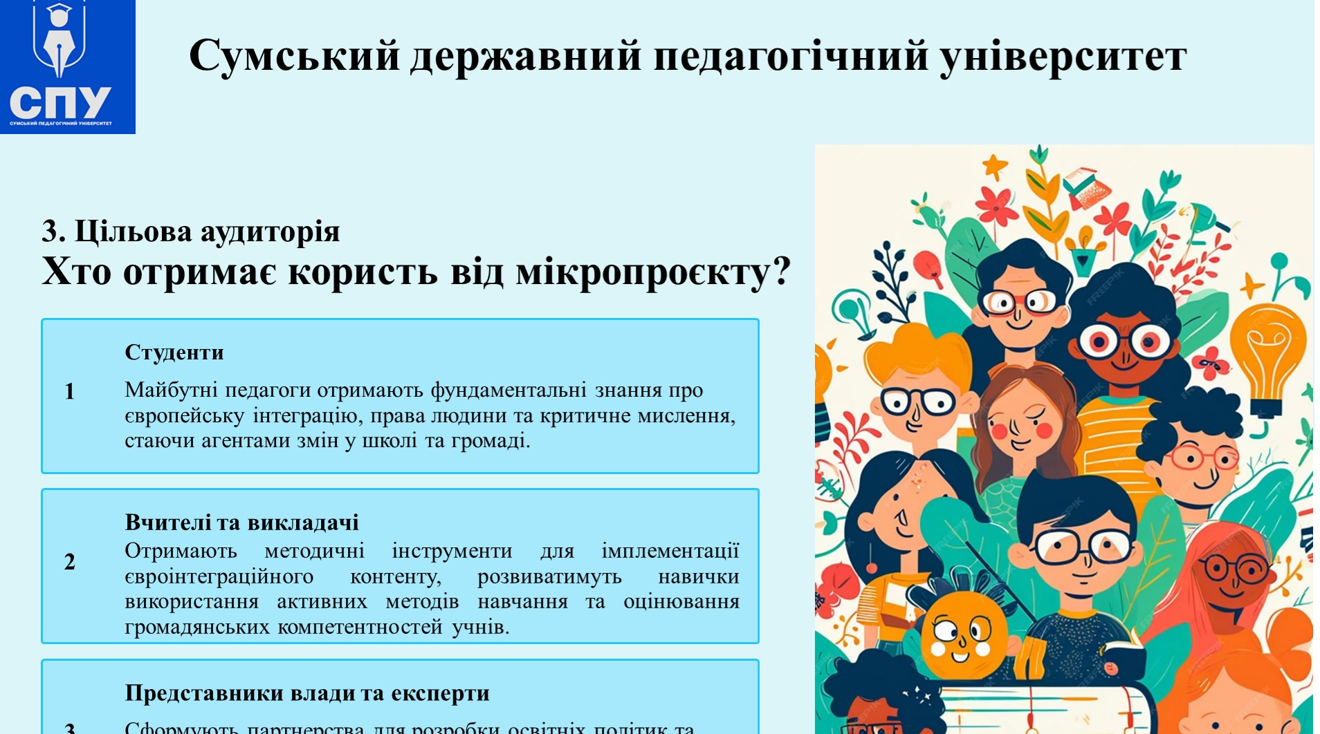 Проєкт передбачає створення навчально-методичних матеріалів, розробку дистанційного курсу та проведення серії практичних занять і тренінгів для педагогів. Його реалізація сприятиме підвищенню професійної компетентності вчителів Сумщини, оновленню змісту громадянської та історичної освіти, а також зміцненню зв’язку між університетською наукою та практикою шкільного навчання.